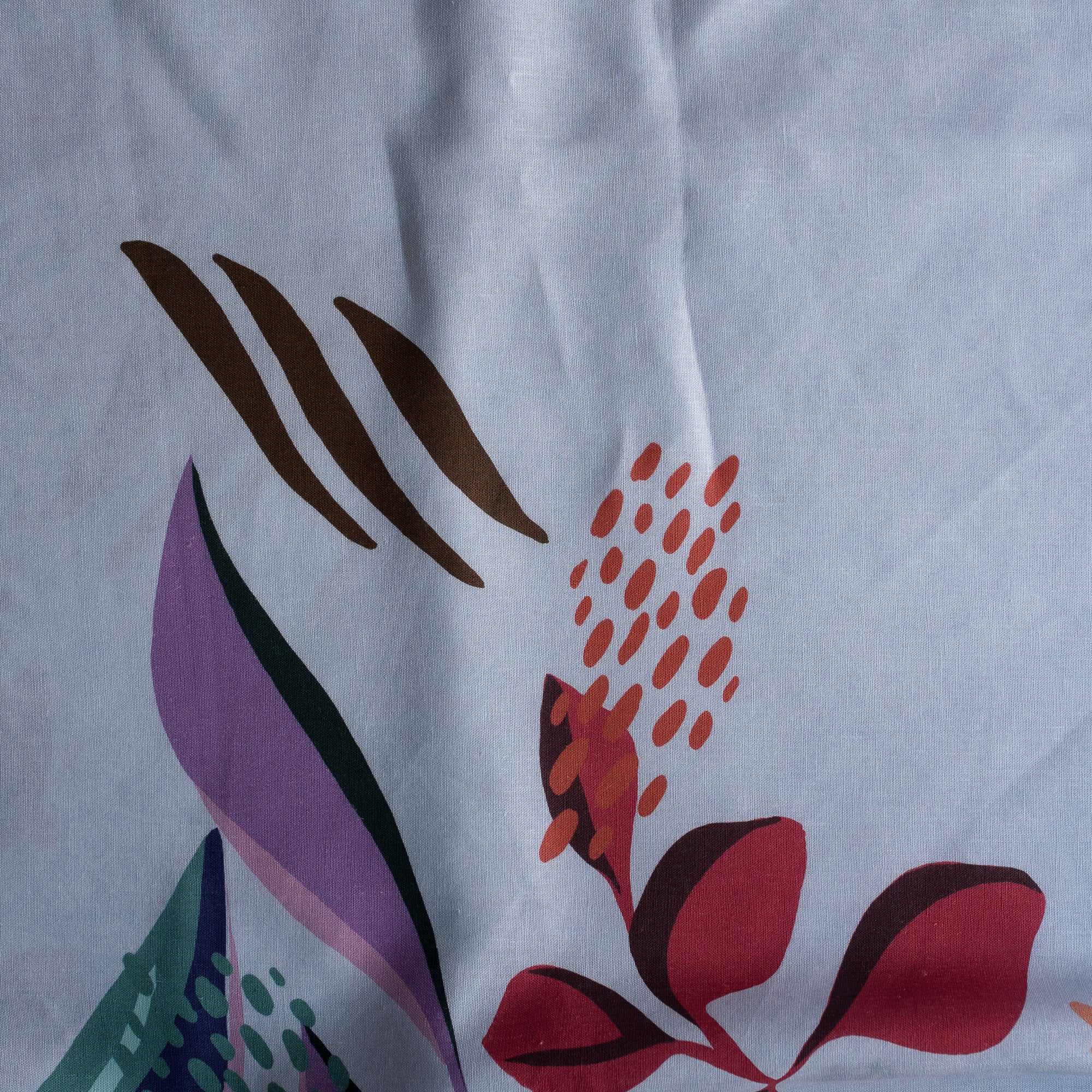 Coastal Botanica is a border printed fabric that captures the relaxed elegance of the shoreline, combining a soft blue-grey base with a lively botanical border in rich, painterly tones. Expressive leaves and petal motifs in crimson, terracotta, lilac, deep green and navy create a vibrant yet balanced design that feels both modern and timeless.