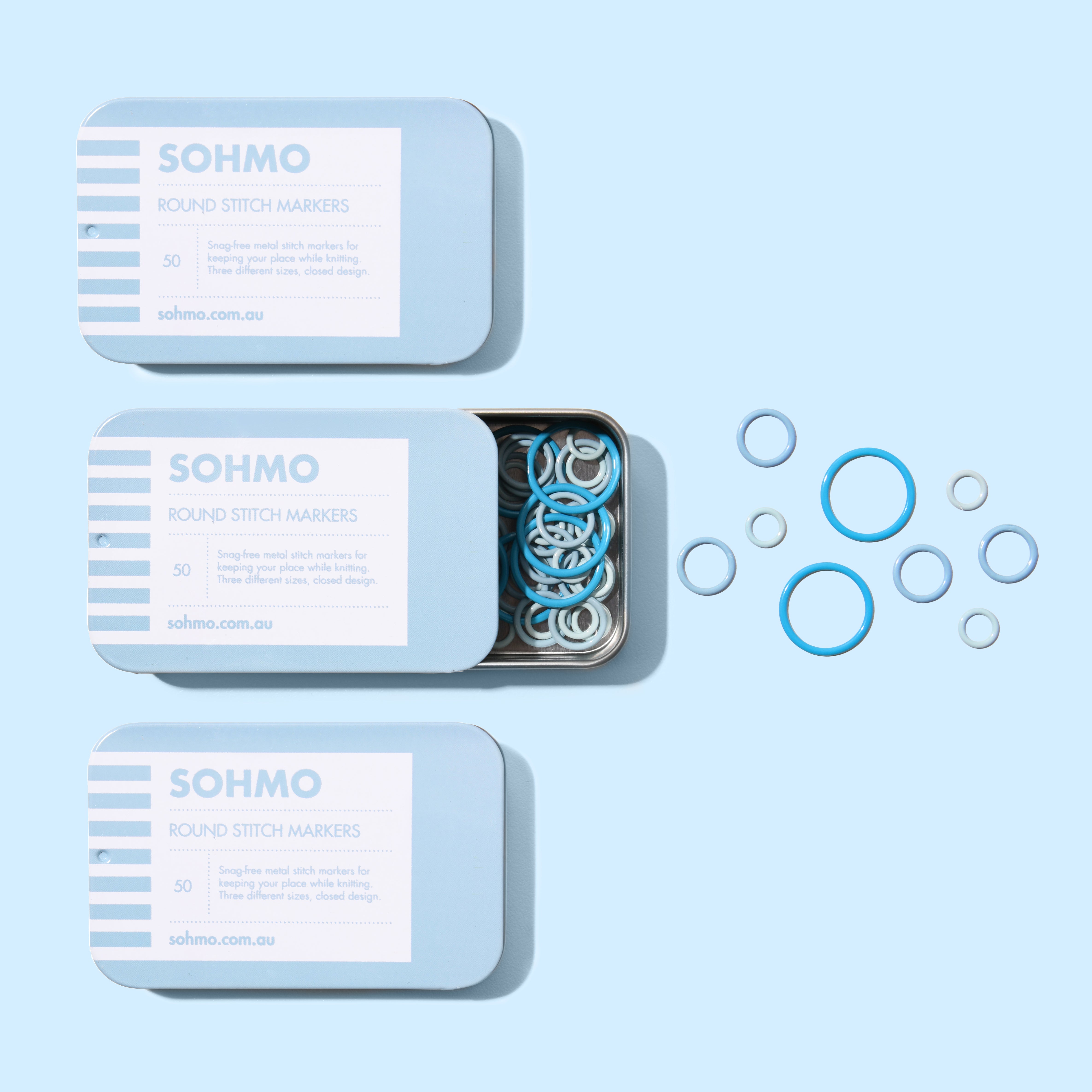 SOHMO Round Stitch Markers are made from enamelled metal with a snag-free finish, designed to glide effortlessly across your needles without catching. The closed design ensures security, while three different sizes offer flexibility for a range of knitting projects. Presented in shades of soft blue, they’re both practical and aesthetically pleasing.